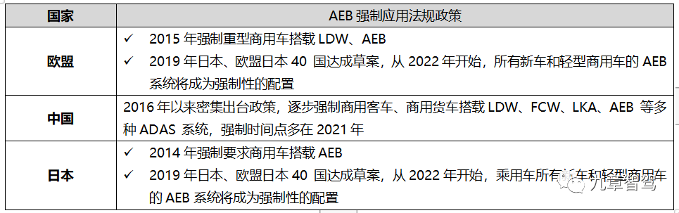 主要國家和地區(qū)政府已經(jīng)擬定時間表全面標配AEB,并且政策的覆蓋范圍從商用車領(lǐng)域逐步擴展到乘用車領(lǐng)域。