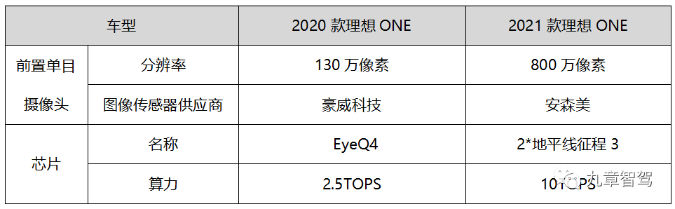 在控制決策芯片上,2021 款理想ONE輔助駕駛芯片已經(jīng)從EyeQ4換成了地平線征程3,算力由原來的2.5TOPS提升至10TOPS。